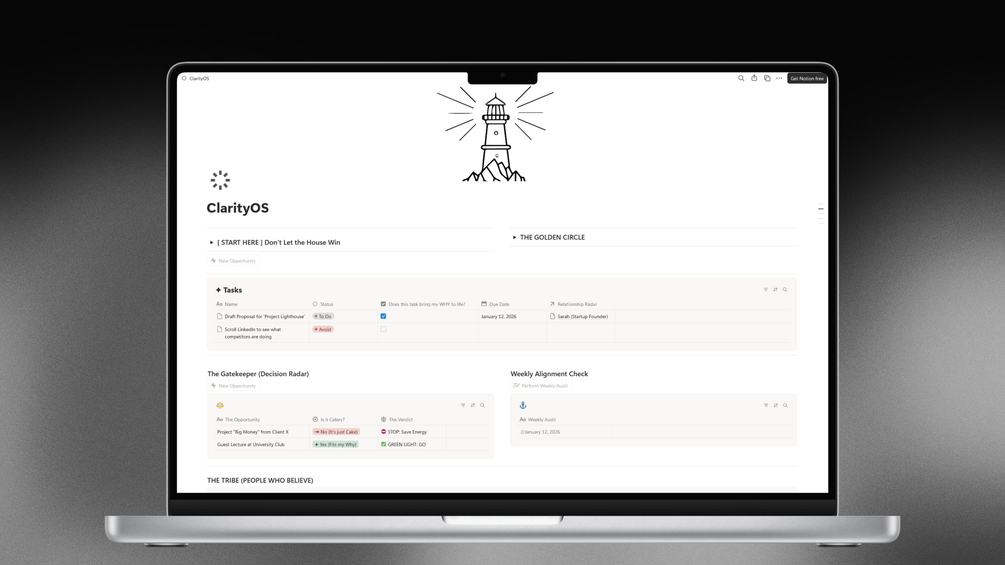 Introducing ClarityOS. A Notion workspace designed to align your biology (Limbic Brain) with your actions (Neocortex). It turns Simon Sinek’s "Golden Circle" theory into a daily practice.