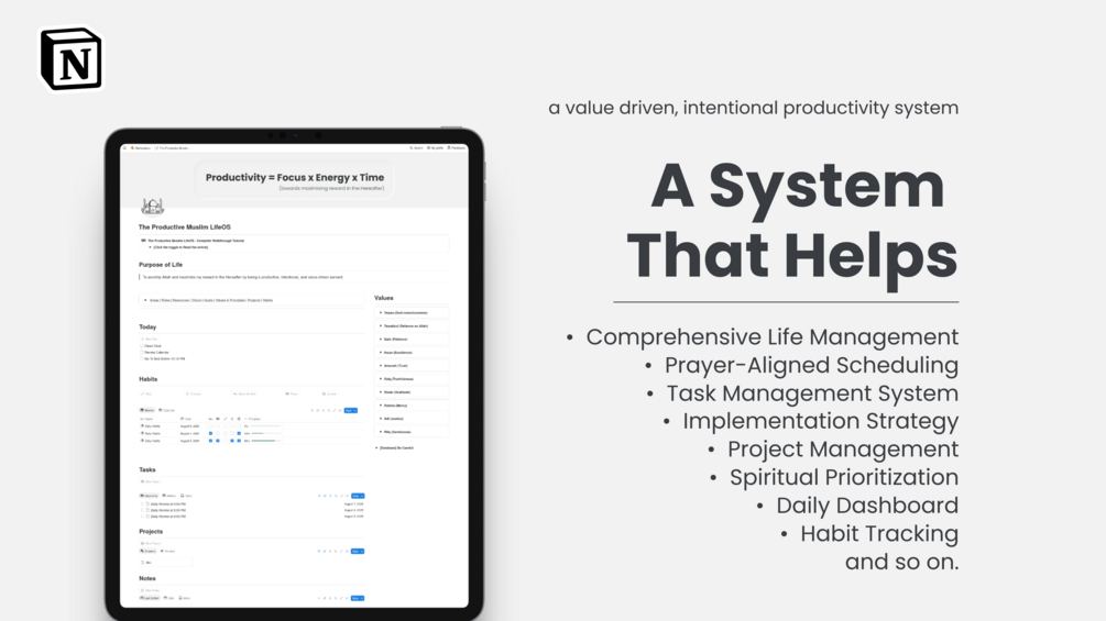 "Productivity = Focus x Energy x Time (towards the Hereafter)." 🕌 Align your Deen and Dunya with The Productive Muslim LifeOS. A comprehensive Notion dashboard to manage Projects, Tasks, and Habits (Salah, Quran) while staying grounded in Islamic values. Duplicate now! 🚀