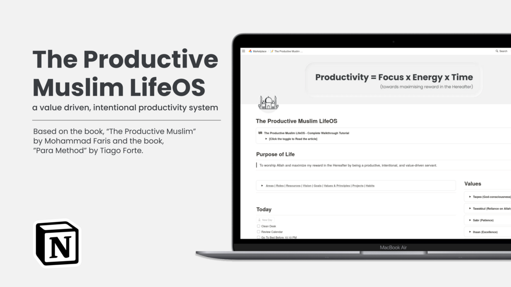 "Productivity = Focus x Energy x Time (towards the Hereafter)." 🕌 Align your Deen and Dunya with The Productive Muslim LifeOS. A comprehensive Notion dashboard to manage Projects, Tasks, and Habits (Salah, Quran) while staying grounded in Islamic values. Duplicate now! 🚀